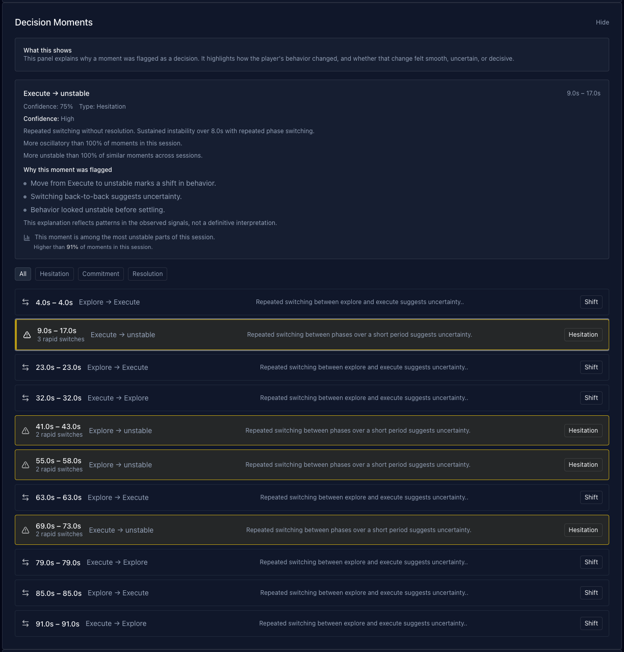 Moments where intent shifts are flagged automatically, letting you jump straight to hesitation, commitment, or strategy changes.