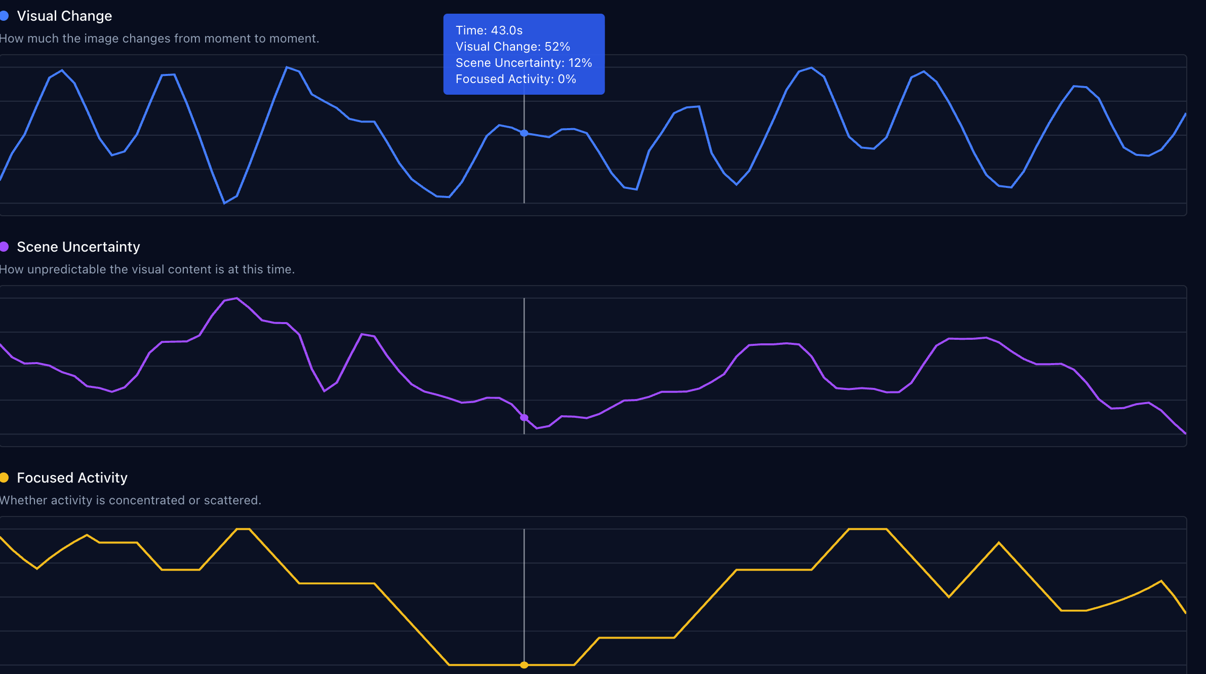 Every decision is backed by visible signals — how much the scene changes, how unstable it is, and how focused the activity appears.